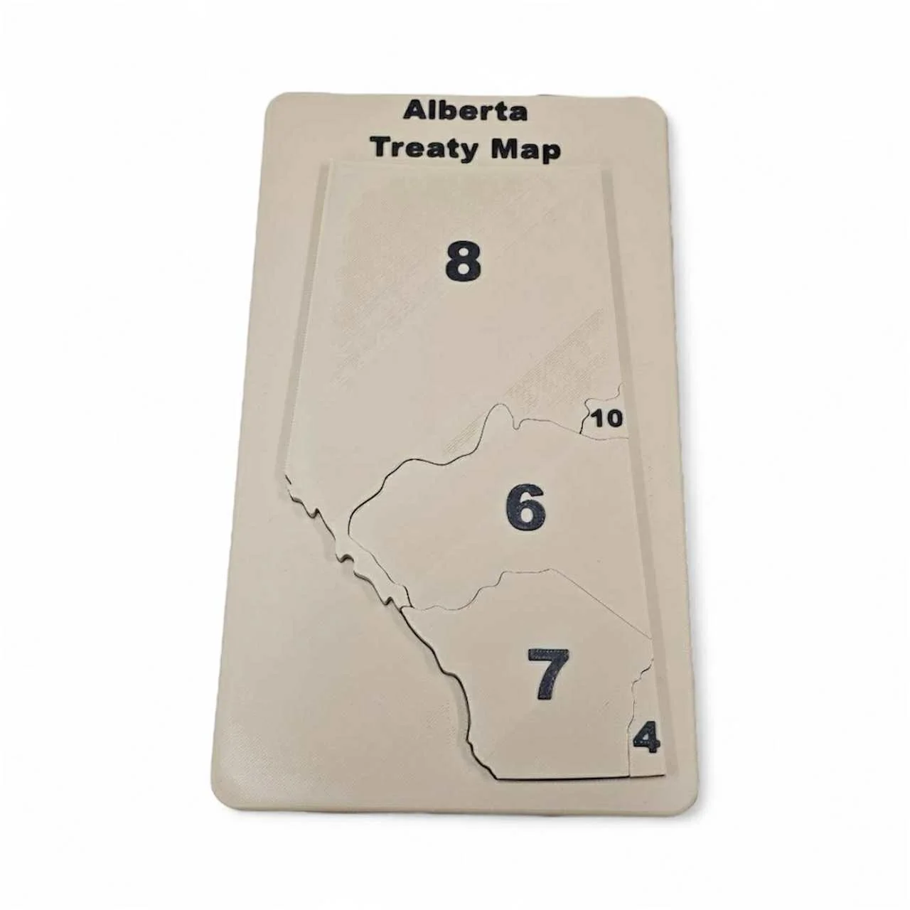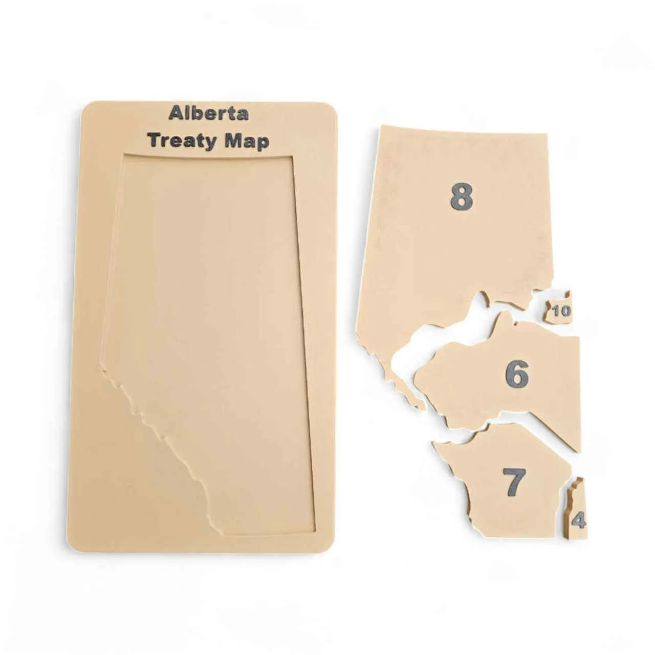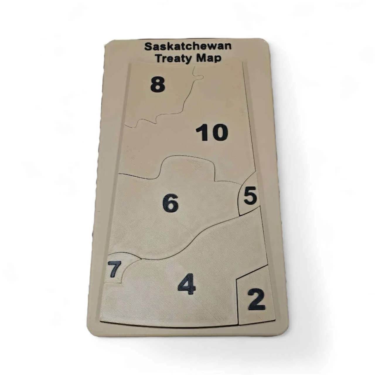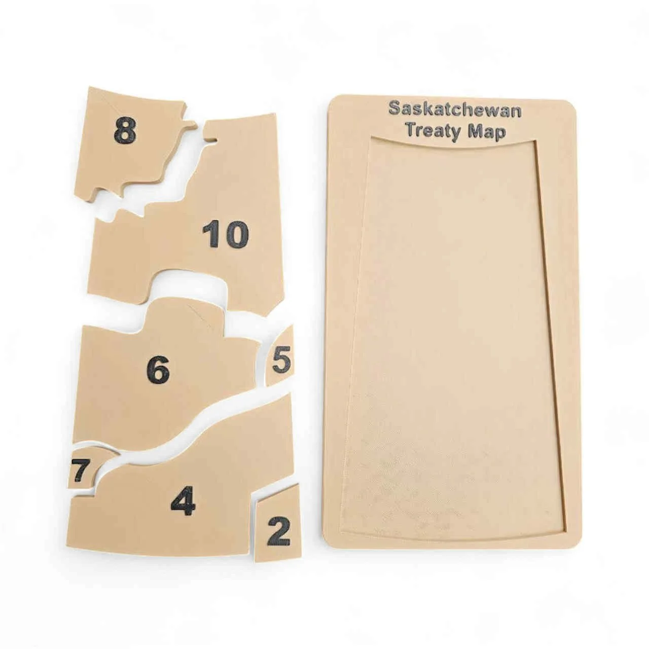 Educational Design: The map showcases the distinct treaty areas within Saskatchewan (Treaties 2, 4, 5, 6, 8, and 10). Each treaty territory is a physical, removable puzzle piece, offering a tactile and engaging way to learn the province's history and the spirit of the treaties.